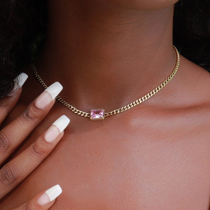 Micro Cuban Necklace w/ Pink Stone in Yellow Gold