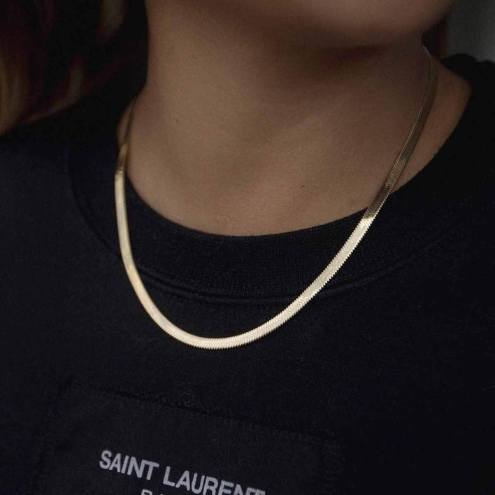 The 4mm Herringbone Chain is a sleek necklace that is sure to become your next staple. This uniquely inspired necklace is sure to make a statement with any look.