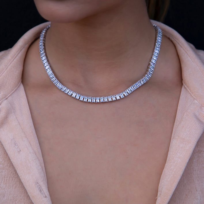 Iced out in large baguette-cut stones, the Baguette Tennis Necklace takes a best-selling classic to a whole new level.