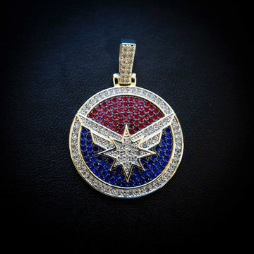 Introducing the Official pendants of the MARVEL Universe. This piece was meticulously crafted with a combination of blue, clear and red hand-set stones to accurately depict the iconic logo of Marvel's strongest superhero, Captain Marvel.