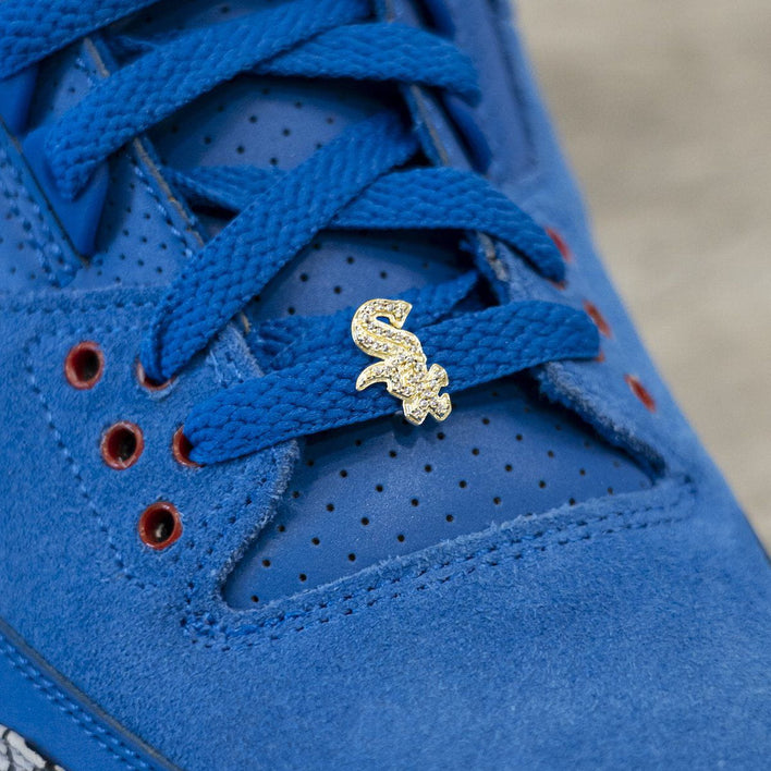 GLD has teamed up with Major League Baseball to introduce official MLB Team Shoelace Charms. Finished in 18k gold plating, this piece was meticulously crafted with hand-set clear stones to accurately depict the iconic logo of the Chicago White Sox. Boss up and celebrate your squad with the official pendant of the White Sox!