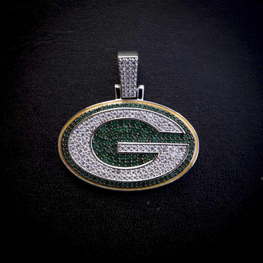 GLD has teamed up with the National Football League to introduce the official NFL Team Pendants. This piece was meticulously crafted with green and clear hand-set stones to accurately depict the logo of the Packers. Flex this NFL season with the official pendant of the Green Bay Packers.