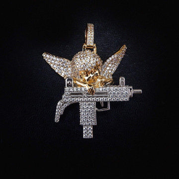 Flooded in dozens of hand-set stones lining the wings, gun and bail, the "Guardian Angel Pendant" is a unique piece ready to protect by any means necessary.
