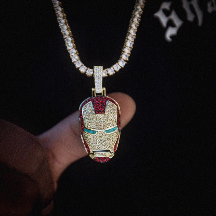 Introducing the Official pendants of the MARVEL Universe. This iconic piece is flooded in a mix of ruby red and yellow stones, meticulously crafted with turquoise enamel for the flash in the eyes, to accurately depict the helmet of the genius, billionaire, philanthropist himself, Iron Man.