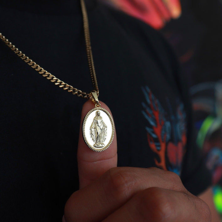 This micro pendant depicts the Lady of Guadalupe the patroness of the Americas and Mexico. A powerful symbol of faith that you can rock with any fit.