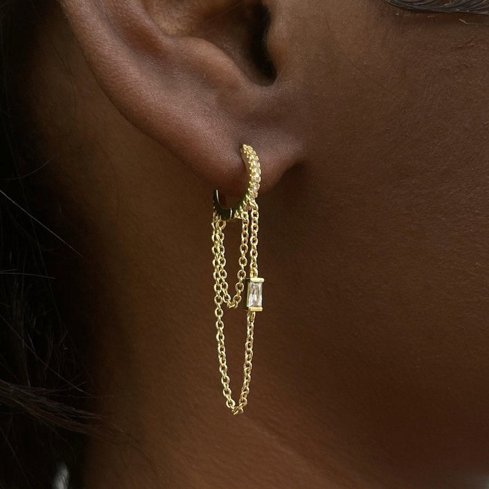 Double Emerald Stone Chain Earrings are a dainty yet eye-catching pair that can be worn with any look. Now available with CZ stones or any diamond of your choice. Wear them individually or pair them in a set to complete your fit.