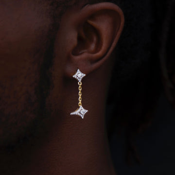 Star Drop Stud Earrings in Yellow Gold are the perfect shiny earring for any occasion. These earrings are iced throughout with two stars, one studded on the lobe and the other hanging right below. Wear them individually or pair them in a set to complete your fit.