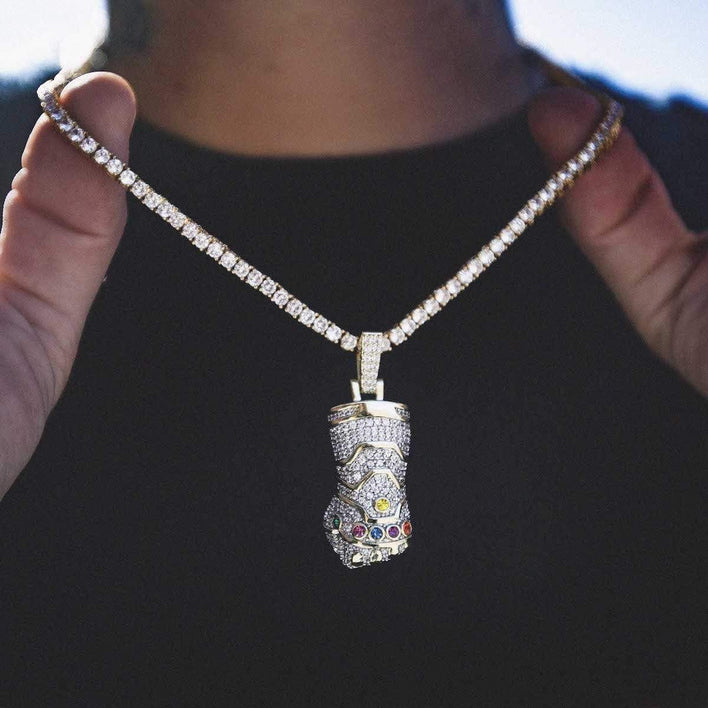 Introducing the Official pendants of the MARVEL Universe. This iconic piece demands attention. Flooded in clear hand-set round cut stones, finished in 18k Gold Plating, this pendant is crafted meticulously to accurately depict Thanos' Infinity Gauntlet.